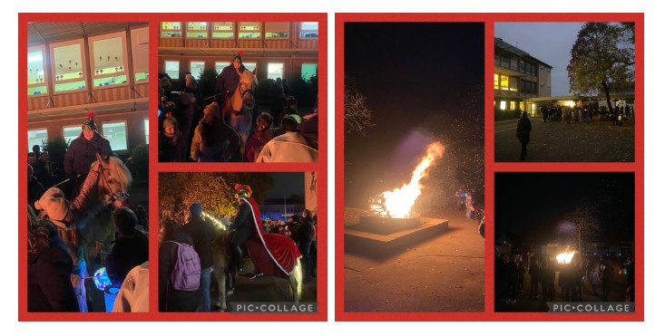 Zurück auf dem Schulhof, wurde ein großes Martinsfeuer entzündet, um bei gemütlicher Atmosphäre mit Martinsbrezeln, Würstchen und Glühwein den Abend ausklingen zu lassen.